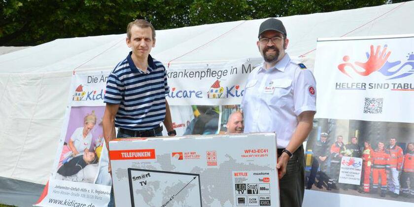 Hochheimer Firma Moravek Elektronikservice4You spendet hochwertigen Fernseher als Hauptpreis für die Tombola der Johanniter-Unfall-Hilfe beim diesjährigen Kinderfest in Mainz