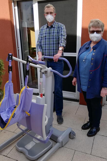 Als Sachspende hat die JHG eine elektrische Aufstehhilfe an Frau Calmes und ihre Mitarbeiter übergeben. Dieser "Lifter" ermöglicht den Pflegekräften ein rückenschonendes Arbeiten und den Senioren ein angenehmes Aufrichten aus der Schlaf- oder Sitzposition