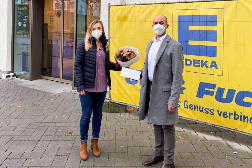 Zur Spendenübergabe war Kinderhausleitung Vanessa Schinski zur EDEKA-Filiale gekommen und hat das Geld entgegengenommen.