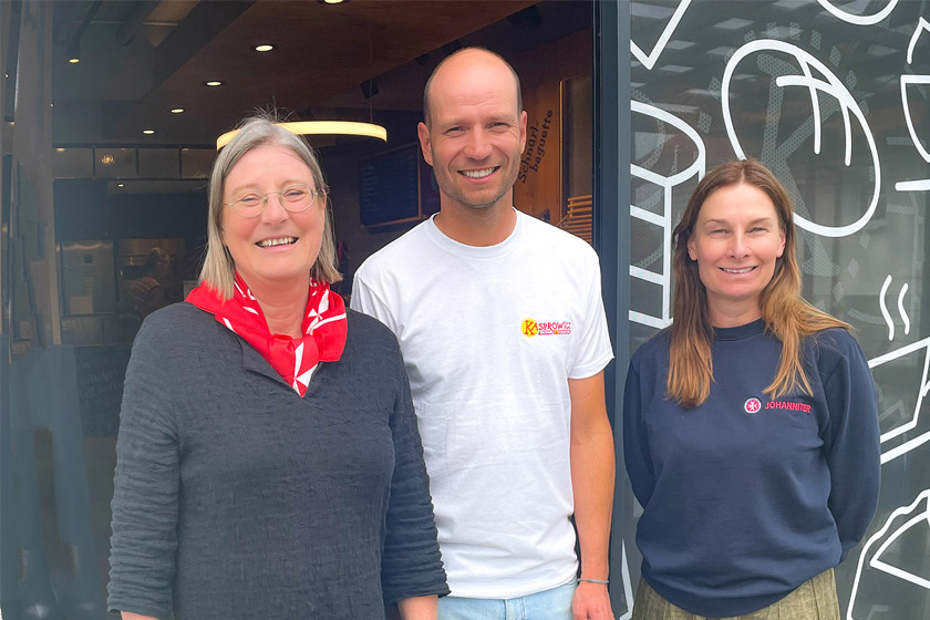 Bildunterschrift: Petra Ott (l.), Einrichtungsleiterin des Marita Beissel Hauses, und Alexandra Reinhart (r.), Regionalvorständin der Johanniter Oberbayern, freuen sich über die Spende der Bäckerei Kasprowicz, überreicht von Geschäftsführer Julian Kasprowicz. Bildnachweis: Anastasia Tarasenko, Johanniter Oberbayern