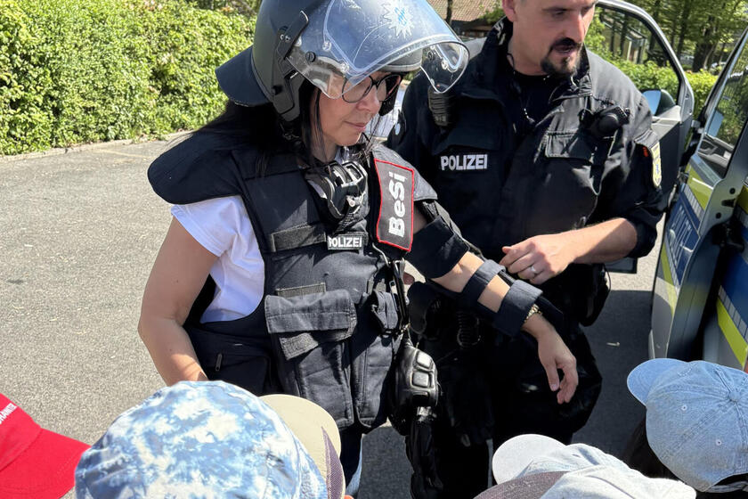 Und es blieb spannend: Die Kinder durften sich das Polizeifahrzeug genauer ansehen und erfuhren alles über die Ausrüstung der Beamtinnen und Beamten. Zum Beispiel die besondere Ausstattung des sogenannten Beweissicherungsteams BeSi, die Beatrice Starklauf vom Kita-Team direkt anprobieren durfte. Ganz schön schwer! Und ganz schön viel, was echte Polizisten so alles an ihrem Körper und an ihrem Gürtel tragen. Wer wollte, durfte dann auch selbst den Warnwestenmantel Probe tragen. Ein bisschen groß für die kleinen Hilfspolizisten, aber ziemlich schick!