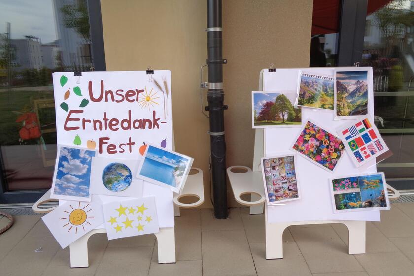 Der Garten der Einrichtung war Schauplatz für das tatsächliche Fest. Alle vier Gruppen des Kinderhauses sangen zu Beginn „Wenn wir zum Erntedankfest gehen“ und sprachen im Nachhinein ein durch Bilder veranschaulichtes Gebet. Anhand des Erntedankaltars haben die Kinder die verschiedenen Obst- und Gemüsesorten kennengelernt.