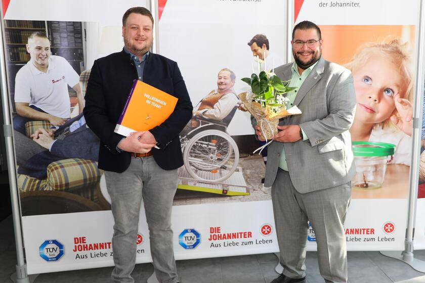 Johanniter-Regionalvorstand Tobias Karl hieß den neuen Sachgebietsleiter an seinem ersten Arbeitstag am 1. Juni 2022 im Team der Johanniter herzlich willkommen und überreichte ein Willkommensgeschenk: „Ich freue mich sehr, dass wir mit René Lui eine Top-Besetzung gefunden haben, mit der unser Fahrdienst weiterhin erfolgreich auf den Straßen unterwegs sein wird.”