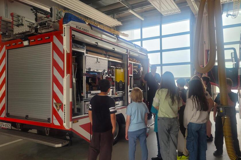 Die Kinder der Johanniter-Ganztagesbetreuung am Martin-Behaim-Gymnasium besuchten die Feuerwache 5 in Nürnberg-Langwasser. Begrüßt wurde die Gruppe von zwei Feuerwehrmännern, die kindgerecht, aber sehr anschaulich erklärten, welche Aufgaben Feuerwehrleute im Alltag übernehmen. Dabei wurde schnell deutlich: Die Feuerwehr löscht nicht nur Brände, sondern hilft auch bei Verkehrsunfällen, Hochwasserlagen und anderen Notfällen.