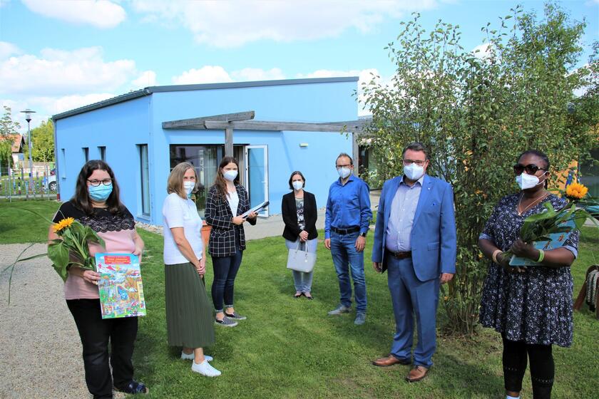 Nach der Doppelvertragsunterzeichnung für die Trägerschaftsübernahme, hatten Johanniter-Regionalvorstand Martin Steinkirchner und Sylvia Meyer, Sachgebietsleitung für Kindereinrichtungen in Regensburg, eine nette Überraschung vorbereitet und überreichten den dortigen Kita-Teams Blumen.