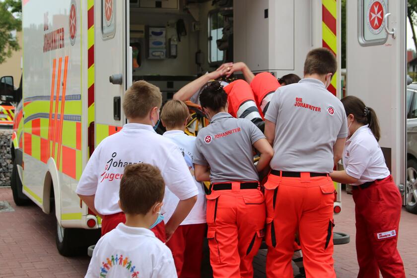 Der Leiter der Jugendgruppe und Retter Martin Lehmann wettete mit den Kindern sogar, sie würden es nicht schaffen, ihn aus einem Keller in den Rettungswagen zu transportieren. Da der Wetteinsatz eine große Tüte Gummibärchen war, stand hier viel auf dem Spiel. Die Aufgabe der Kinder war es, den patientegerechten Transport auszutüfteln und zu organisieren. Beim Anheben griffen ihnen dann die „großen Sanis“ unter die Arme und gemeinsam schafften sie es, den über 2 Meter großen Johanniter mit einem Rettungstuch nach oben auf eine Sanka-Liege zu tragen.
