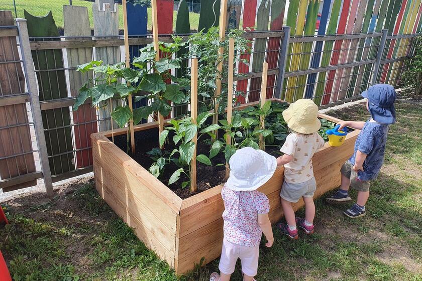 Die Bayerischer Lloyd AG hatte die finanziellen Mittel für das Hochbeet zur Verfügung gestellt, und der Edeka Dirnberger in Wenzenbach hat im Anschluss für den „Zaubergarten“ Erde und Pflanzen gespendet. Dazu gehörten auch verschiedene Obst- und Gemüsesorten. Einrichtungsleitung Christina Reichel bedankte sich und erzählte: „Die Kinder haben sehr viel Spaß an der Gartenarbeit und gießen ganz fleißig. Wir freuen uns auf einen ´ertragreichen´ Sommer mit vielen Leckerbissen aus unserem eigenen Krippengarten.“