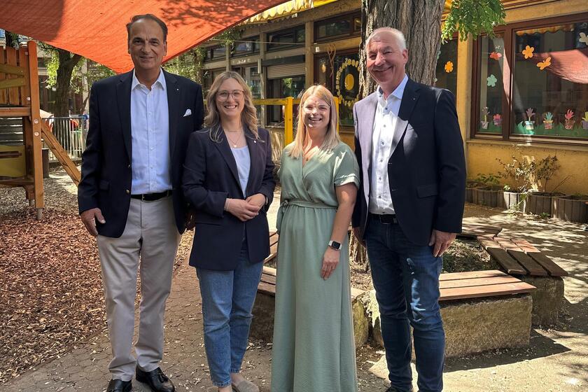Die Spendenübergabe fand in der Johanniter-Kita „Kindertraum“ im Stift Haug statt. Dabei waren das ehrenamtliche Vorstandsmitglied der unterfränkischen Johanniter, Dr. med. Frank Schiefelbein, die Einrichtungsleitung Selina Geißler, Vera Götz, hauptamtliches Mitglied des Regionalvorstandes der Johanniter, sowie Thomas Kestler, Vorsitzender des Hilfswerks des Lions Clubs Würzburg-West, vor Ort.