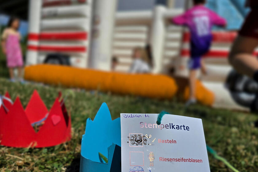 Dieses wichtige Jubiläum muss natürlich gefeiert werden - und zwar am besten mit den "Hauptpersonen"! Das Kita-Team der Kinderinsel hatte deshalb zum zehnten Geburtstag ein Sommerfest speziell für die Krippen- und Kindergartenkinder vorbereitet. Die Einrichtung verwandelte sich für einen Tag in einen Olympiaparcours mit fünf Stationen: Vom Bewegungsparcours über die Hüpfburg und der Riesenseifenblasenstation bis hin zu den Glitzertattoos und dem Basteln von Kronen. Bei strahlendem Sonnenschein konnten die Kinder an den verschiedenen Stationen spielen, basteln, toben und ihre Jubiläumsstempelkarten abzeichnen lassen.