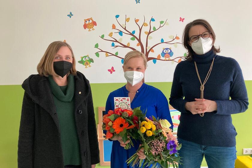 Zur offiziellen Amtseinführung kamen Stefanie Kaps, HR-Business-Managerin und Ansprechpartnerin der Bayernwerk AG und Sylvia Meyer, Sachgebietsleitung Kindereinrichtungen in Ostbayern. Dabei überreichte Sylvia Meyer der neuen Krippenleitung einen Blumenstrauß und hieß sie im Namen der Johanniter herzlich willkommen.