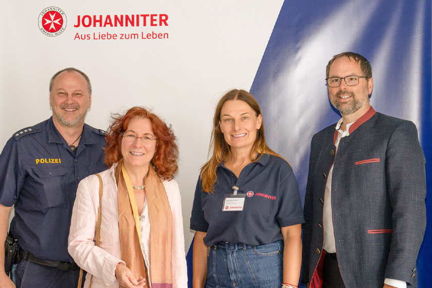 Bildunterschrift: Alexandra Reinhart (hauptamtliche Regionalvorständin der Johanniter Oberbayern, 2. v. r.) begrüßt Klaus Hofmeister (stellvertretender Dienststellenleiter der Polizei Germering), Marianne Klaffki (stellvertretende Landrätin des Landkreises Dachau) und Andreas Magg (Bürgermeister von Olching, v. l.). Bildnachweis: Anastasia Tarasenko.