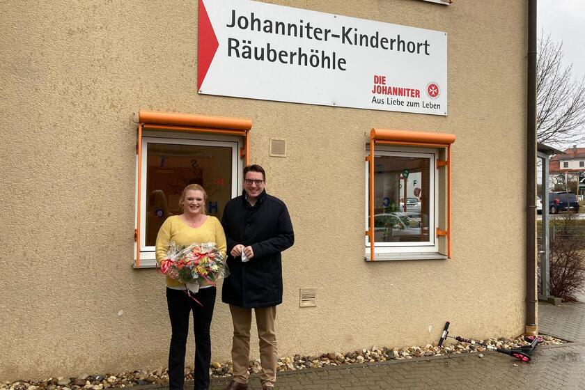 Im Namen der Johanniter begrüßte Sylvia Meyer, Sachgebietsleiterin Kindereinrichtungen bei den Johannitern, und Sebastian Koch, Bürgermeister der Gemeinde Wenzenbach, Magda-Lena Deutzer als neue Einrichtungsleitung im Kinderhort „Räuberhöhle“.