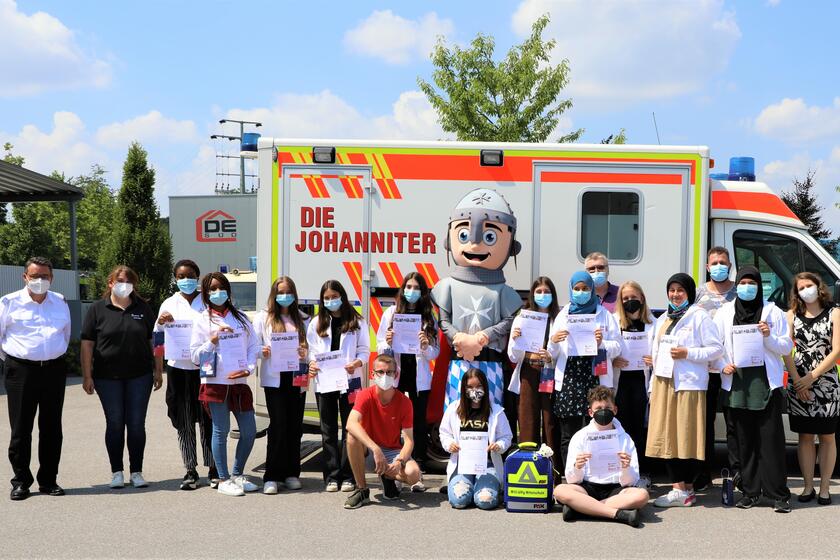 Anschließend wurden den Schülerinnen und Schülern bei einer Präsentation die Dienste der Johanniter genauer erklärt und auf eventuelle Engagementmöglichkeiten hingewiesen. Danach bestaunten die Schüler die Regionalgeschäftsstelle samt Rettungswache und den Rettungswagen. Zum Schluss erfolgte die Zertifikatsübergabe durch Regionalvorstand Martin Steinkirchner.