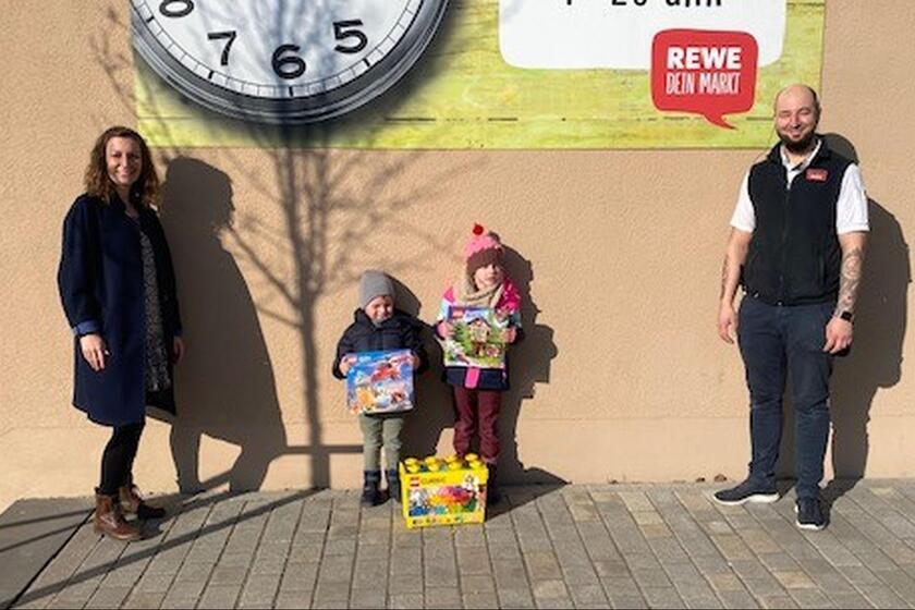 Vsevolod Malyukin, Marktmanager der Rewe-Filiale, hatte den Kindergarten bei der Pfandspendenaktion des Discounters eingetragen. Dadurch haben Kunden des Rewe-Marktes die Möglichkeit ihren Pfandbon nicht selbst zu nutzen, sondern ihn zu Gunsten der Kindereinrichtung zu spenden. Mit dem ersten Betrag, der durch die Aktion des Marktes zusammengekommen ist, konnte das Team bereits Legosteine für die Kinder erwerben. Vsevolod Malyukin übergab das Spielzeug dann an Karola Tamm, Einrichtungsleitung des Kinderhauses, und zwei Kinder der Einrichtung.