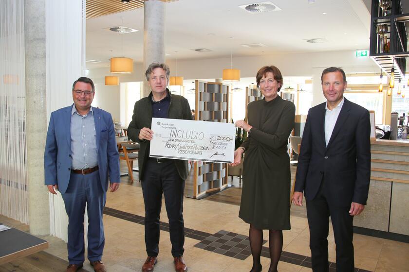 Regensburg Große Freude bei allen Verantwortlichen des Johanniter-Inklusions-Hotel „INCLUDiO“. Die Einrichtung darf sich über eine großzügige Spende des Regensburger Rotary Clubs „Porta Praetoria“ freuen. Regionalvorstand Martin Steinkirchner und Hotelleiterin Helga Butendeich nahmen den symbolischen Scheck in Höhe von 2000 Euro von den Rotary-Club-Vertretern Dr. Christian Hannke und Thomas Zink entgegen.