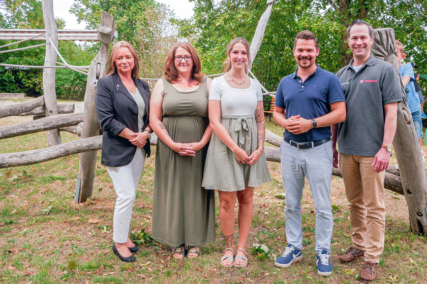 Bildunterschrift: (v.l.n.r.) Barbara Ottmann, Corinn Mayr (Vorsitzende Elternbeirat), Lisa Sachsenweger, Stefan Floerecke, Ulrich-Joachim Müller im Garten der Einrichtung