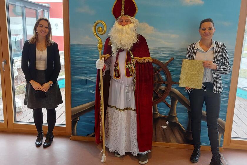 Bildunterschrift: v.l.n.r. Beate Winterholler, Sachgebietsleitung Kinderbetreuungseinrichtungen, der Nikolaus, Sabina Di Rienzo, Einrichtungsleitung