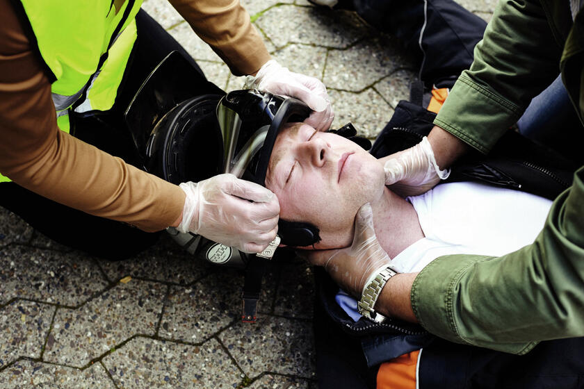 Wenn es trotz aller Vorsicht zu einem Motorradunfall kommt, muss ein Ersthelfer zunächst die Unfallstelle absichern. Dann sollte geprüft werden, ob die verunfallte Person ansprechbar ist. Bleibt sie ohne Reaktion, ist eine Helmabnahme unumgänglich. Nur so kann gewährleistet werden, dass der Verletzte nicht an Erbrochenem oder seinem eigenen Blut erstickt. Ist eine weitere Person am Unfallort, sollte diese assistieren, indem sie Hals und Kopf waagerecht hält. Anschließend sollte der Verunglückte in die stabile Seitenlage gebracht werden, auch wenn er an der Wirbelsäule verletzt sein könnte. Dann wird die Notrufnummer 112 gewählt.