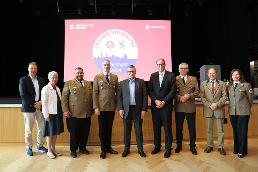 Bildunterschrift: v.l.: Dirk Müller (Sicherheitsreferent der Stadt Ingolstadt), Dr. Dorothea Deneke-Stoll (2. Bürgermeisterin der Stadt Ingolstadt), Tobias Karl (Mitglied des Regionalvorstandes der Johanniter Ostbayern, Projektleiter Tag der Johanniter 2024 in Ingolstadt), Dr. Johannes von Erffa (Mitglied des Landesvorstandes der Johanniter Bayern), Dr. Florian Herrmann (Staatsminister), Prof. Hans-Joachim Hof (Vizepräsident der Technischen Hochschule Ingolstadt), Andreas Hautmann (Mitglied des Landesvorstandes der Johanniter Bayern), Prof. Dr. Dietrich von Schweinitz (Kommendator der Bayerischen Genossenschaft des Johanniterordens), Alexandra Reinhart (Mitglied des Regionalvorstandes der Johanniter Oberbayern), Bildnachweis: Matthias Walk
