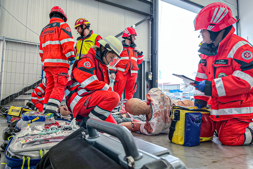 Für die Ehrenamtlichen lag diesmal der Schwerpunkt auf der taktischen Patienten Ablage, Gefahrenstoffe (CO), sowie Anschlagszenarien. In verschiedenen Skill-Trainings lernten sie den schnellen Transport von Patienten aus Gefahrenbereichen.
