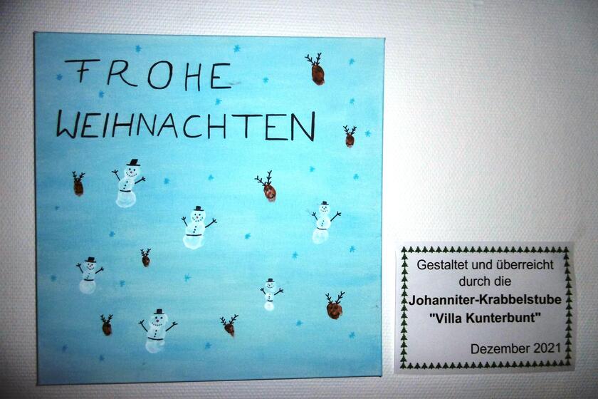 Gemeinsam haben die Kinder in der Johanniter-Krabbelstube ein Plakat mit winterlichen und weihnachtlichen Motiven darauf gebastelt. Das Plakat haben die Kinder gemeinsam mit Einrichtungsleitung Anna Hartmann und Kinderpflegerin Jennifer Streitberger an Mitarbeiter des Seniorenzentrums übergeben.