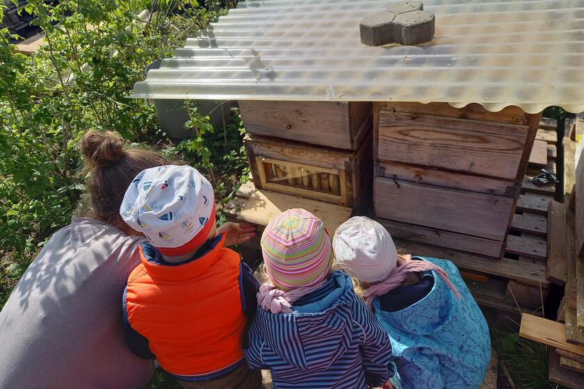Gemeinsam mit dem Erzieher-Team machten sich die „Wiesenzwerge“ auf den Weg zu Matthias Gerl, einem Imker aus Tegernheim. In seinem Garten hat er zwölf Bienenvölker, und außerdem noch Hühner und Küken. Die Kinder schauten sich mit großer Begeisterung im Garten um und durften sogar einer brütenden Henne zusehen.