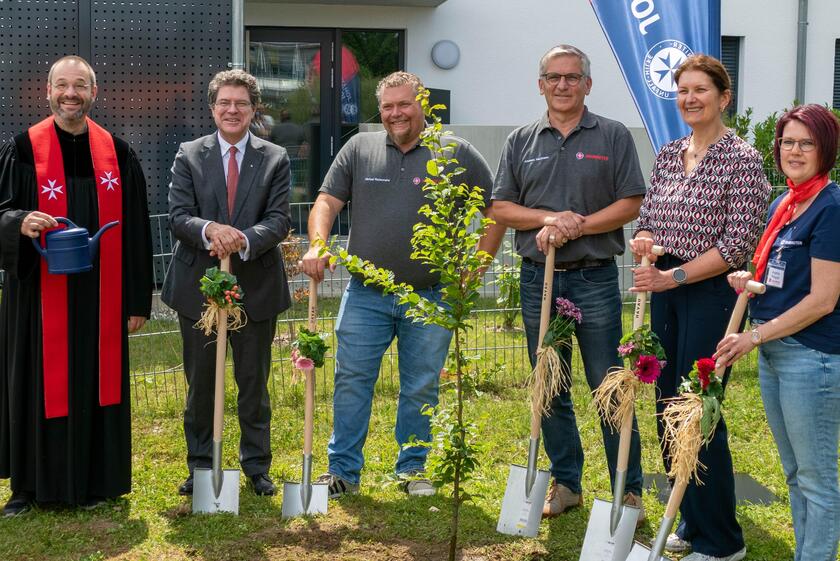 Michael Thoma, Landesverbandspfarrer der Johanniter in Bayern, Christian Meyer-Landrut, Mitglied des Bundesvorstandes der Johanniter-Unfall-Hilfe e.V., Michael Rettenmaier, Mitglied des Regionalvorstandes der Johanniter in Bayerisch Schwaben, Andreas Hautmann, Mitglied des Landesvorstandes, Claudia Schäfer-Rudolf, erste Bürgermeisterin der Stadt Senden, und Angelika Mangold, Leitung der Königskinder, beim Pflanzen des Baums im Garten der Einrichtung