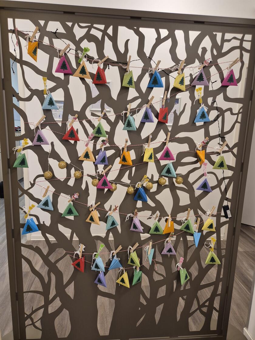 Dieses Jahr hatten wir einen Adventskalender-Baum. In jedem Tütchen befand sich ein selbst gebastelter Engel und eine süße Überraschung.