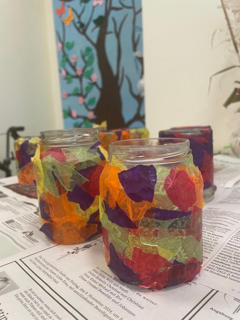Gemeinsam mit den Kindergartenkindern bastelten unsere Tagespflegegäste mit viel Freude und Lachen diese wunderschönen Tischlaternen.