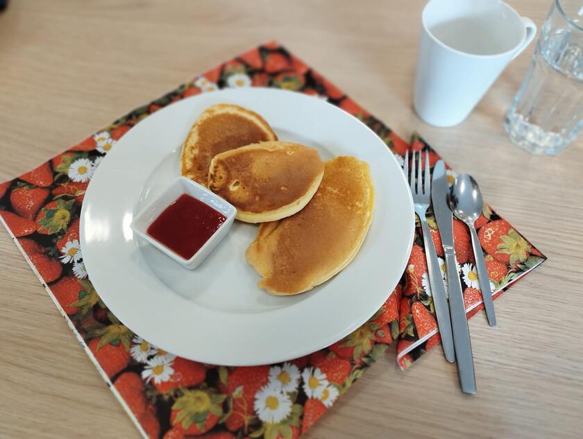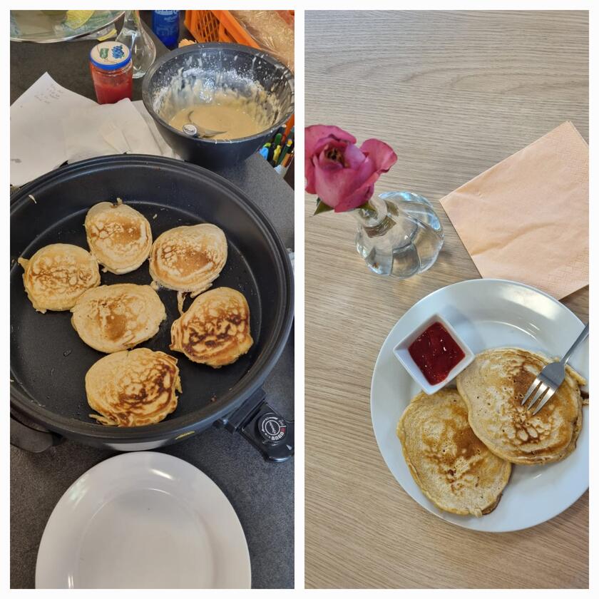 Das “besondere Frühstück” hatte dieses Mal einen leicht amerikanischen Touch. Es gab Pfannkuchen mit selbstgemachter Erdbeermarmelade.