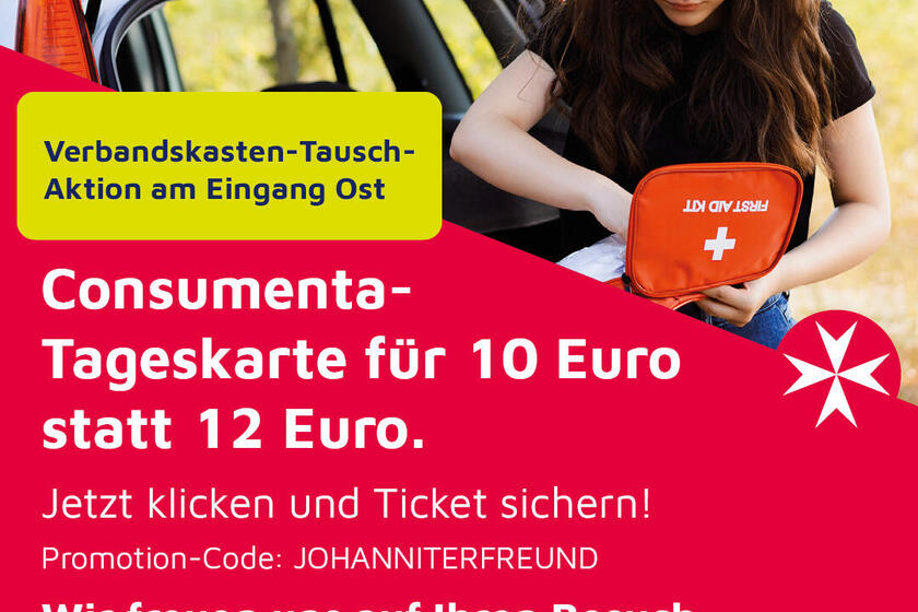 „Wir freuen uns natürlich auch, wenn die Messebesucher zu uns an den Stand im Gesundheitsbereich in der Halle 3C kommen. Für unsere Gäste haben wir noch ein besonderes Extra. Mit den Johannitern sparen sie beim Kauf einer Tageskarte. Geben sie beim Kartenkauf unter www.consumenta.de/ticket einfach folgenden Code ein: JOHANNITERFREUND.“