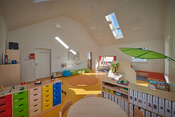 Unsere Räumlichkeiten Das Obergeschoss bietet Platz für zwei Gruppenräume, einen Bastelraum, einen Intensivraum mit Ruhe-Ecke, ein Badezimmer für Kinder mit Wickelmöglichkeit sowie Toiletten. Im Erdgeschoss befinden sich unser Essraum, eine Küche, ein Turnraum mit Zugang zum Garten, die Garderobe, eine Waschküche mit Waschmaschine und Trockner und ein Materialraum. Ein Büro, der Personalraum sowie Toiletten sind ebenfalls im Erdgeschoss. Unsere Einrichtung ist barrierefrei und verfügt über einen Aufzug.