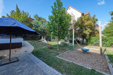 Garten: In unserem Außenbereich gibt es viele Möglichkeiten zum Sandspielen, Schaukeln, Bobby-Car-Fahren und Klettern.