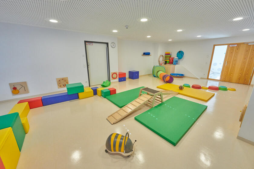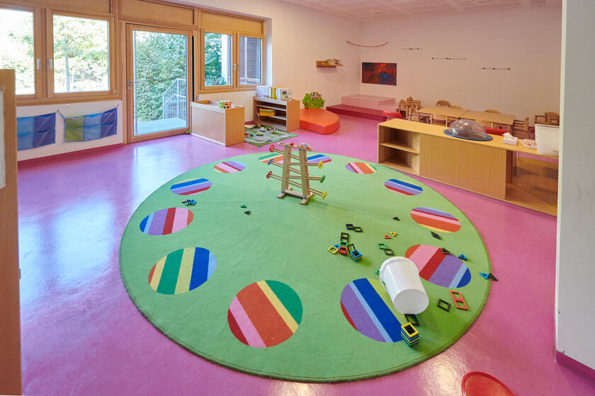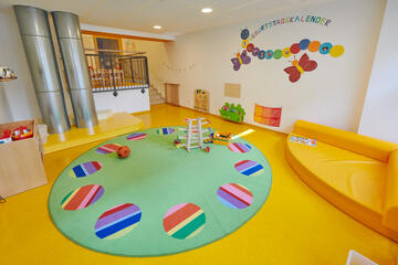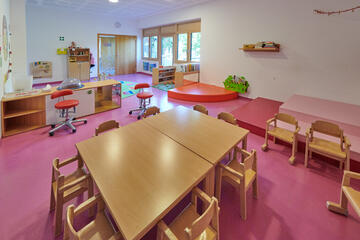 Jede Gruppe hat einen eigenen Gruppenraum mit Schlafraum und einen Flurbereich mit Garderoben. Außerdem gibt es eine gemeinsame Turnhalle, eine Küche, Sanitärbereiche, einen Mehrzweckraum sowie ein Büro und einen Personalraum.