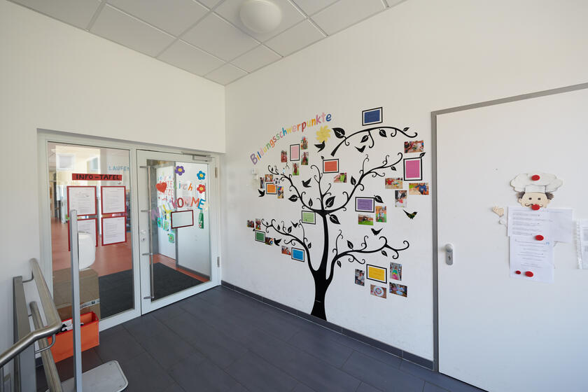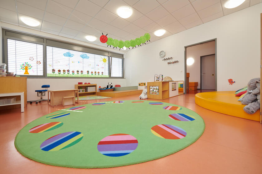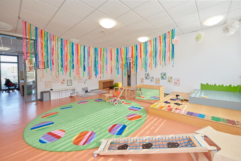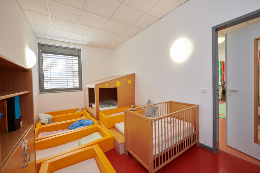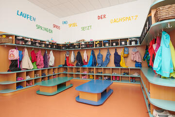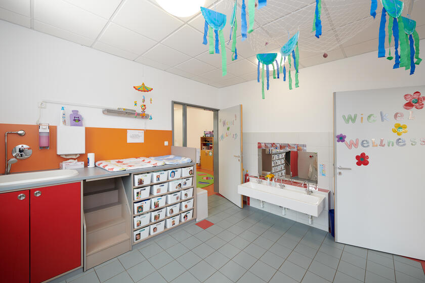 Jede Gruppe hat einen eigenen Gruppenraum mit angeschlossenem Schlafraum, der in verschiedene Ecken unterteilt ist: Die Bauecke, die Puppenecke sowie die Kuschel- und Leseecke. Den großen Flur nutzen die Kinder gemeinsam und können dort ihren natürlichen Bewegungsdrang ausleben. Im Bällebad werden die Kinder sanft massiert. Zwei große, helle Waschräume mit Kinderkrippentoiletten und großem Wickelbereich vervollständigen die Einrichtung.