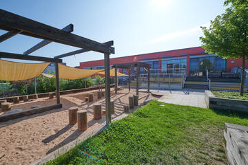 Unsere Einrichtung verfügt über einen 800 qm großen Garten auf dem Dach einer Norma-Filiale. Dort gibt es viele Möglichkeiten zum Sandspielen, Schaukeln, Bobby-Car-Fahren und Klettern sowie zum Pflanzen und Ernten.