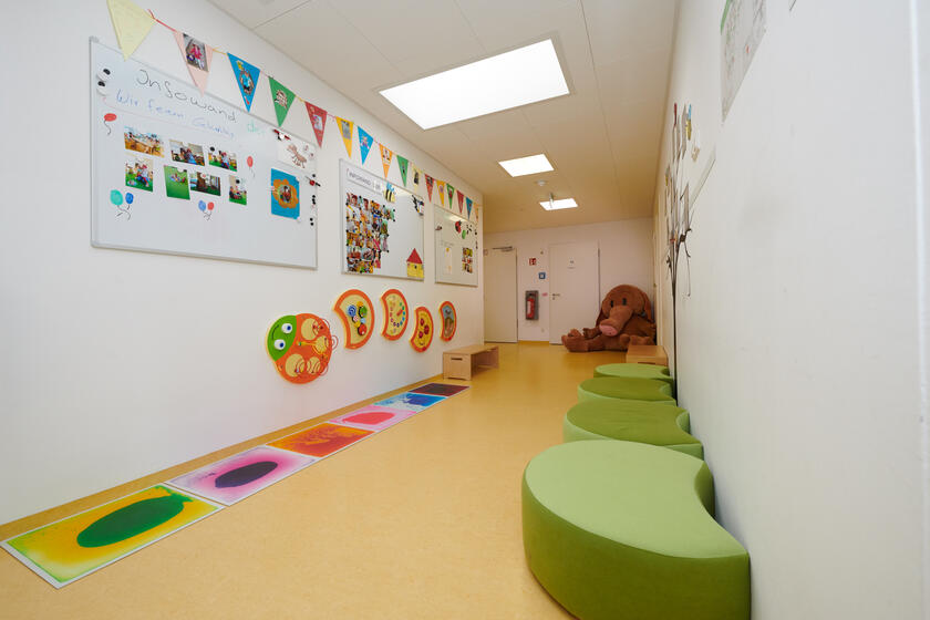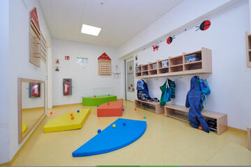 Alle Gruppenräume sind hell und freundlich ausgestattet. Jeder Gruppenraum bietet Platz zum basteln, spielen, toben, aber auch einmal zurück ziehen in die Kuschelecke ist möglich. Sämtliche Möbel sowie alle Spielmaterialien sind auf Krippenkinder ausgerichtet und bieten ein sicheres stabiles Umfeld für alle Kinder. Zu jedem Gruppenraum, gehört ein eigenes Badezimmer für die Kinder, sowie ein eigener kleiner Schlafsaal. Unsere Krippe erreicht man, durch einen großzügigen hellen Eingangsbereich, der sich in einem großen Flur erstreckt. Dieser Flur wird auch als Spielbereich durch die Kinder gern angenommen.