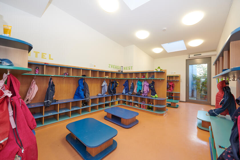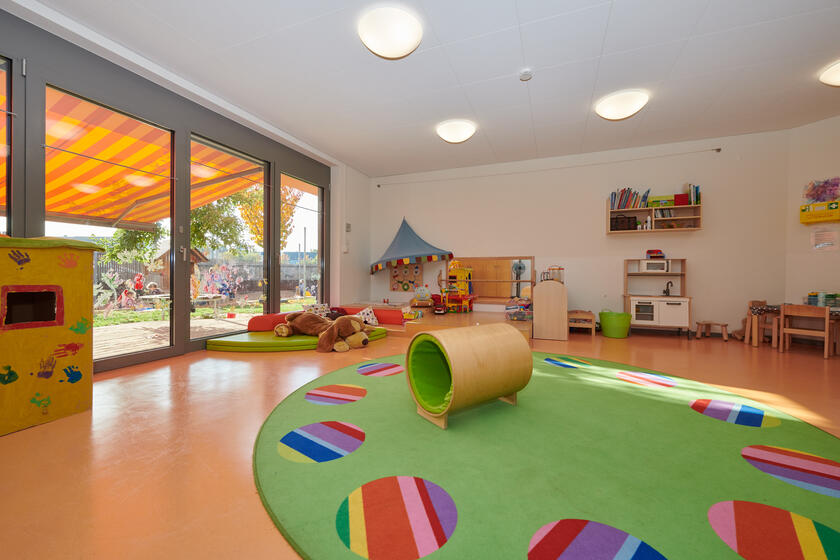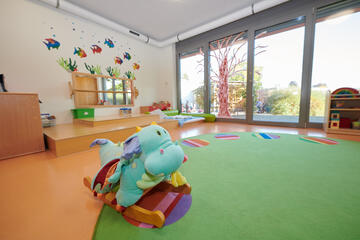 ein Büro und ein Personalraum sind ebenfalls im Erdgeschoss. Das Obergeschoss bietet Platz für unsere beiden Kindergartengruppen, die in zwei Stammgruppen im halb offenen Konzept gefördert und betreut werden. Die Gruppenräume werden durch ein Atelier, einen Turnraum und einer Spielburg ergänzt.