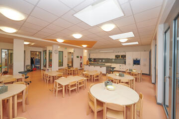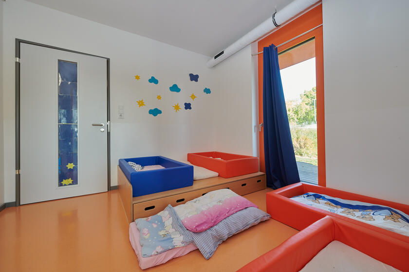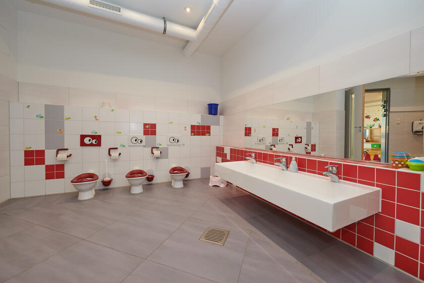 Im Erdgeschoss befinden sich die Gruppenräume der drei Krippengruppen mit je einem Funktionsraum, der als Schlafraum genutzt wird. An jeden Krippen-Gruppenraum grenzt ein Waschraum mit Toiletten an. Unser Kinderbistro,