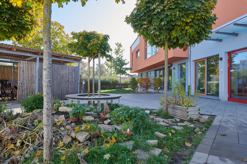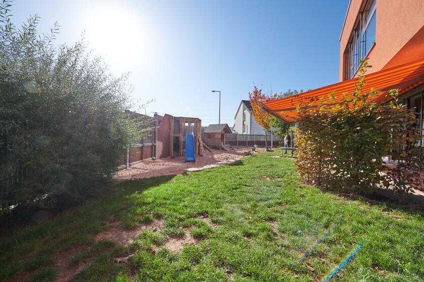 Unsere Einrichtung verfügt über zwei Außenspielbereiche: Einen gepflasterten Bereich mit einer Fahrzeugstrecke, einer Kräuterschnecke und Hochbeeten sowie einen großen Spielbereich mit Sandkasten, Vogelnestschaukel, Barfuss-Weg, Spielhaus und einem Kletter- und Rutschbereich.