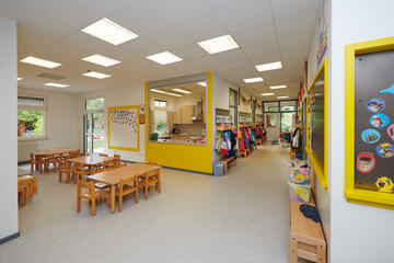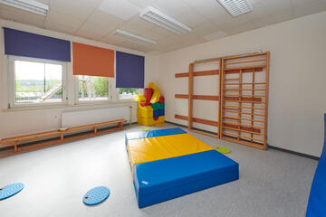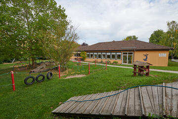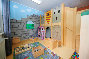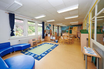 Für jede Gruppe gibt es einen Gruppenraum und einen Flurbereich mit Garderoben. Die Sanitärbereiche für Kleinkindgruppe und Kindergarten sind getrennt. Außerdem haben wir eine Turnhalle, einen Mehrzweckraum, einen Lagerraum und ein Büro.