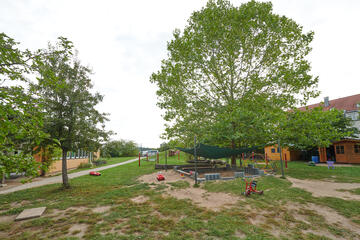 Unser großer Garten bietet den Kindern vielfältige Möglichkeiten zum Spielen: Sie können schaukeln, klettern, im Sand spielen oder Bobby-Car fahren und unser Bauwagen lädt zu wissenschaftlichen Experimenten ein.