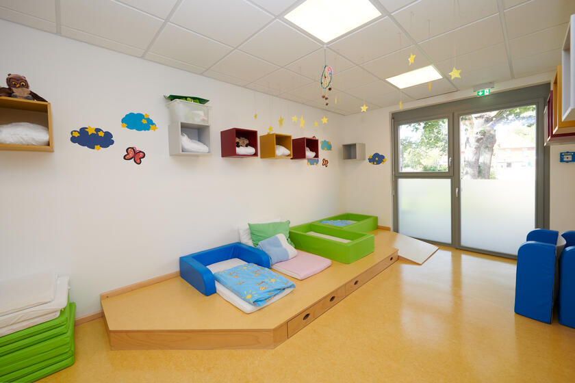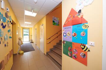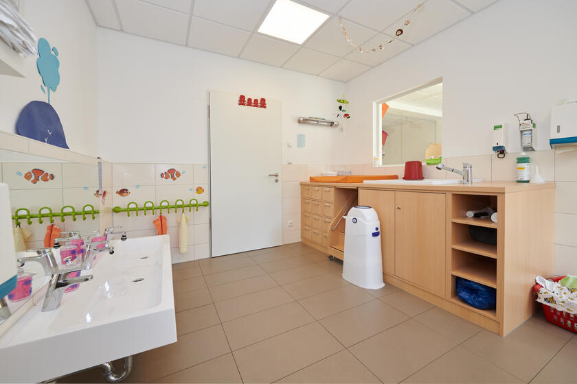 Räumlichkeiten Die Krippen bestehen jeweils aus einem Gruppenraum mit Rutschbahn, einem Schlafraum, der auch als Funktionszimmer dient, und einem Badezimmer mit Wickelmöglichkeit und Toiletten. Dem Kindergarten steht zusätzlich zum Gruppenraum ein kleiner Nebenraum zur Verfügung, der als Verkleidungszimmer und Ruheraum dient. Der Hort besteht aus einem Gruppenraum und einem Hausaufgabenzimmer. Dem ganzen Haus steht ein Werk-raum, ein Bewegungsraum und ein Bistro zur Verfügung. Außerdem gibt es auf jeder Etage Sanitärbereiche sowie im Erdgeschoss eine Küche. Büro und Personalräume befinden sich im Altbau.
