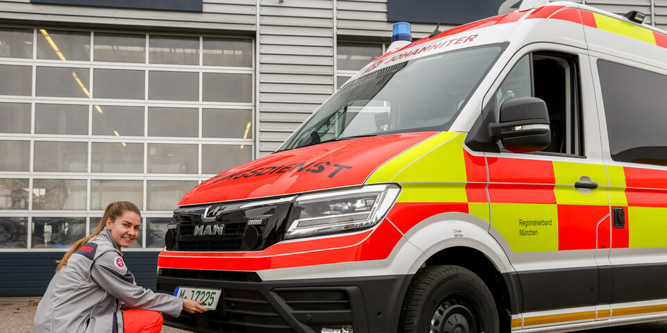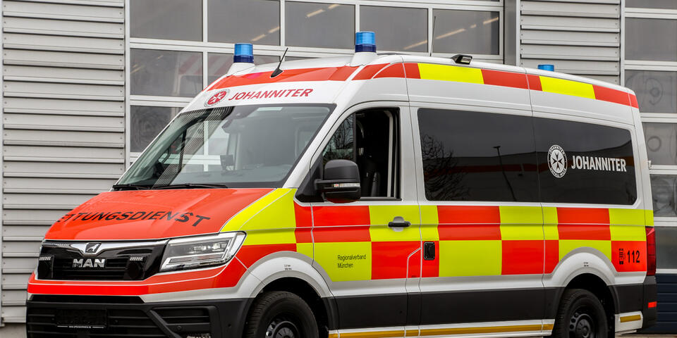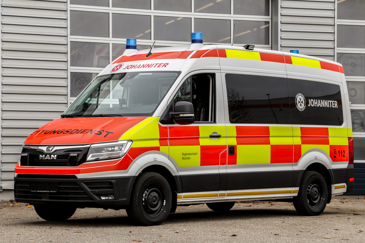 Ein Expertenteam mehrerer Hilfsorganisationen hat das knapp sechs Meter lange Fahrzeug gemeinsam mit dem Aufbauhersteller Ambulanz Mobile auf Basis eines MAN TGE 3.140 entwickelt. Eingesetzt wird das neue Modell künftig von allen Hilfsorganisationen in Bayern. Neu im 140 PS-starken Basisfahrzeug sind eine Motor-Weiterlaufschaltung, die etwa bei Absicherung an Unfallstellen genutzt werden kann, um die Stromversorgung über einen langen Zeitraum aufrechtzuerhalten. Ebenfalls an Bord: Sitzheizung für Fahrer und Beifahrer, Standheizung, eine Umfeldbeleuchtung und ein Abbiegekamerasystem. Im Heckbereich werden die neuen Krankentransportwagen mit leuchtgelb retroreflektierenden Warnfolien zur Verbesserung der Erkennbarkeit bei Dunkelheit beklebt.
