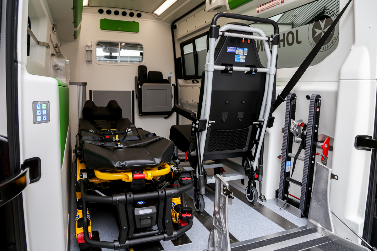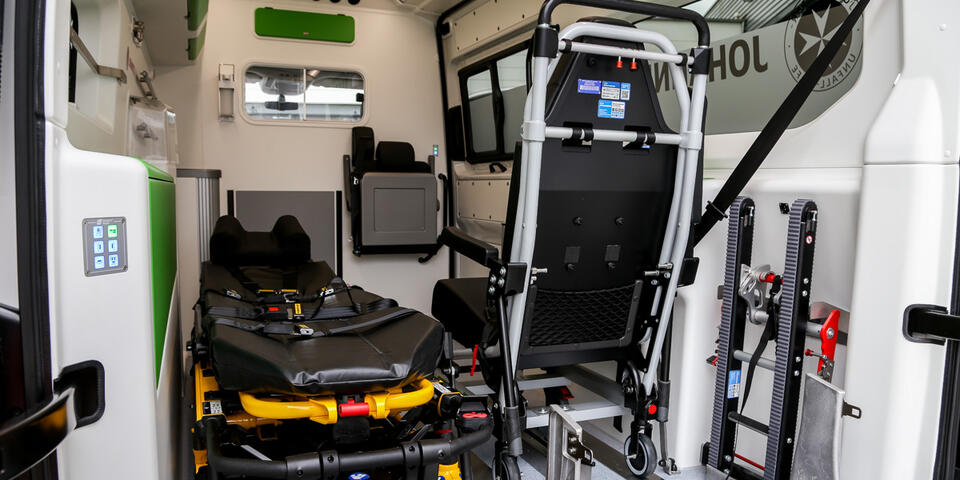 Ein Highlight der Fahrzeugausstattung ist ein abnehmbares Raupenmodul für den Tragestuhl, das einen für die Einsatzkräfte ergonomischeren Treppentransport ermöglicht. „Auch die Fahrtrage ist elektrohydraulisch verstellbar“, so Hiltermann. „Angenehm für die Patienten, aber auch gut für unsere Einsatzkräffte, da das Umlagern und Einladen so schonender geschieht.“