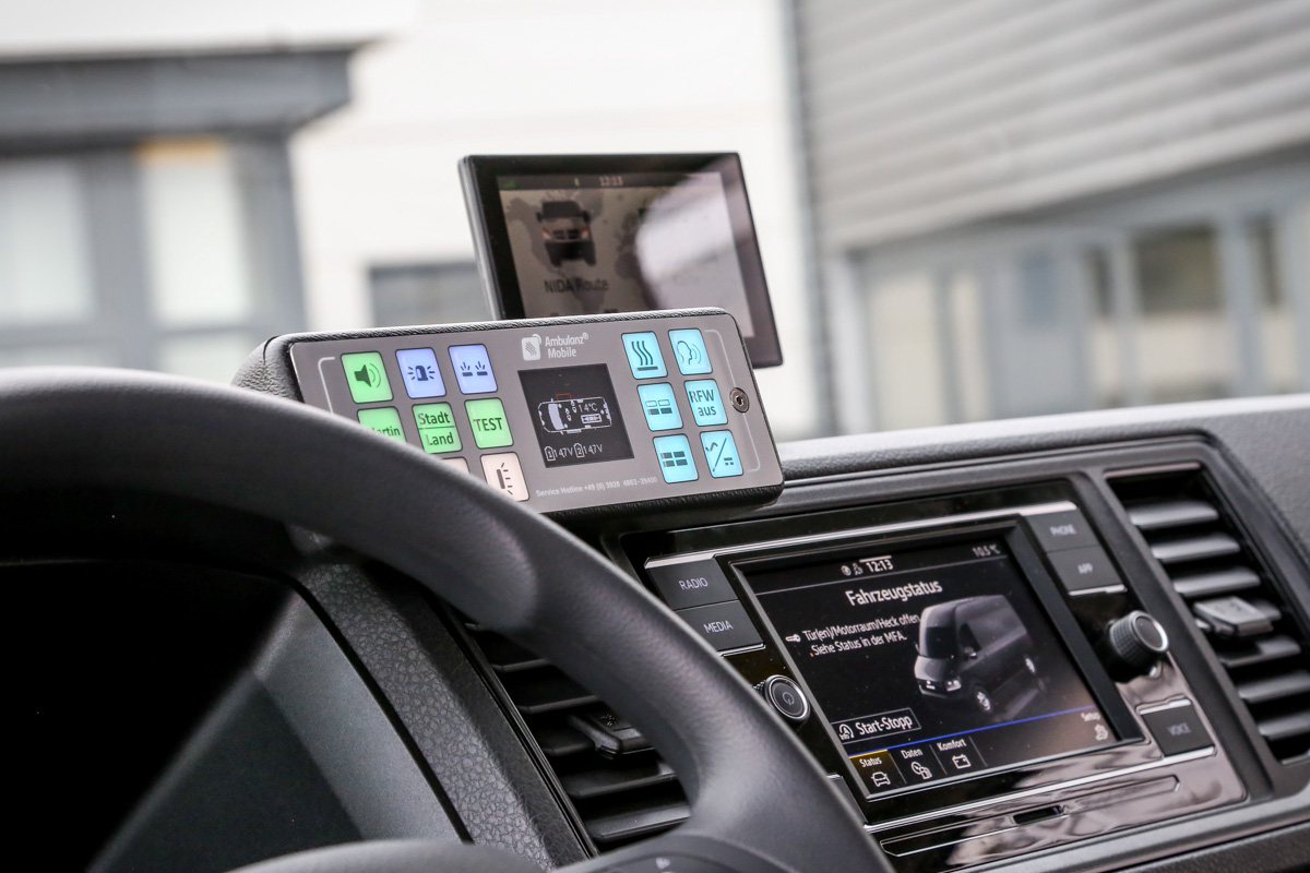 Darüber hinaus wird das Fahrzeug mit einer stationären sowie einer mobilen Sauerstoffanlage, einem automatischen externen Defibrillator mit EKG-Überwachungsmonitor, einer elektrischen Absaugpumpe und einem Notfallrucksack bestückt.