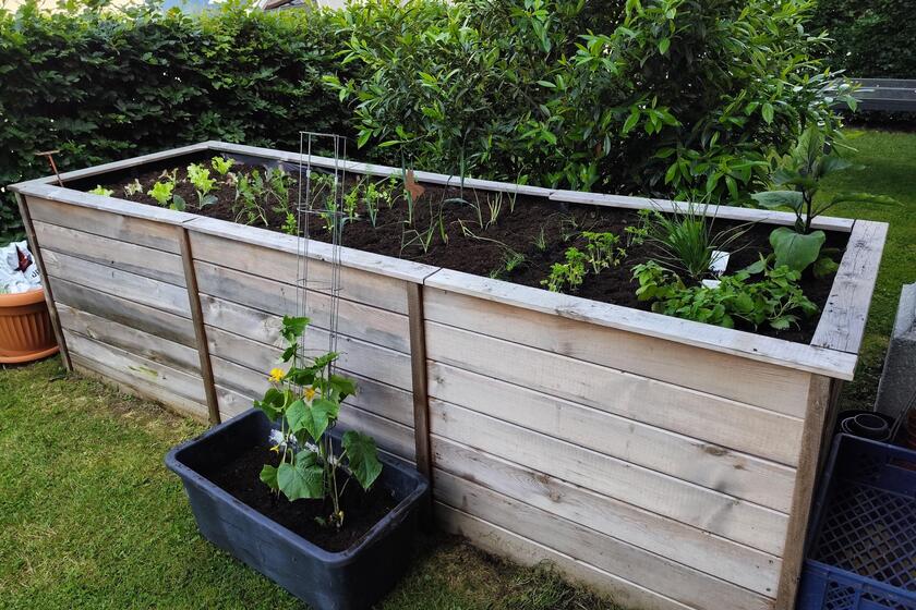 In dem Hochbeet wurden Auberginen, verschiedene Kräuter, Pflücksalat, Tomaten und Gurken gepflanzt. Alle sind gespannt auf die erste Ernte und die frischen, selbst angebauten Lebensmittel, die unser tägliches Angebot bereichern werden.
