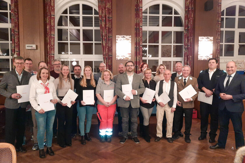 Regionalvorstand Uwe Kinstle überreichte gemeinsam mit dem Schlüsselfelder Bürgermeister Johannes Krapp Auszeichnungen für das Engagement während der Corona-Pandemie sowie der Flutkatastrophe im Ahrtal. Mit Leistungsabzeichen in Bronze und Silber geehrt wurden außerdem Ehrenamtliche, die mehr als 1000 bzw. 2000 Dienststunden geleistet haben. 21 Einsatzkräfte, die sich als Funktionsträger im Bevölkerungsschutz zum Beispiel als Einsatzleiter Rettungsdienst oder Zugführer besonders einbringen, erhielten ihre Bestellungsurkunden für die kommenden fünf Jahre. Insgesamt wurden beim oberfränkischen Ehrungsabend 42 Helferinnen und Helfer gewürdigt.