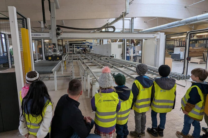 Die Vorschulkinder der Johanniter-Kinderinsel Reckendorf hatten viel zu staunen beim Besuch der örtlichen Schreinerei Hornung: Eine riesige Halle mit Maschinen und Robotern! In einer Schreinerei wird Holz verarbeitet, das wussten die kleinen Besucher schon vorher, aber dass eine Schreinerei heute ganz anders aussieht als zum Beispiel die Werkstatt von Meister Eder und dem Pumuckl war eine spannende Entdeckung!