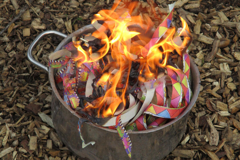 Highlight für alle war aber der gemeinsame Faschingsspaziergang durch Schlüsselau. Auch viele Anwohner und Passanten freuten sich über die bunt verkleideten Kinder, die mit Bonbons, Faschingsmusik und „Schlüsselau, Helau!"-Rufen durch den Ort zogen. Doch irgendwann ist auch die schönste Zeit vorbei: Mit dem Verbrennen der übrig gebliebenen Luftschlangen wurde der Fasching an Aschermittwoch verabschiedet. Die Kinder durften spüren, wie sich die Asche anfühlt, die im Anschluss mit Erde gemischt und in Blumentöpfe gefüllt wurde, um Samen darin einzupflanzen. Die Kinder sind schon jetzt ganz gespannt, was dieses Jahr Schönes daraus wächst.
